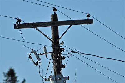 After a hot chocolate and a snack, we were ready for Snowy Owls. We took the 417 to the next exit, and went left to Concession 20. There we saw Rick stopped and we pulled up behind to find out that we had driven by not one, but two Snowy Owls, including one on a pole at the corner! Chagrined we walked back to photograph it. It flushed but went down, then came back to an even better perch on a nearby utility pole. We had driven past, but saw the others stop, so circled back. This time the owl did not flush and we got some great shots.