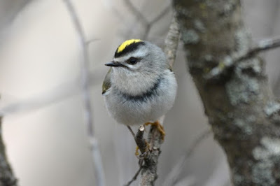 We headed back along the creek trail. At the beaver dam, we spotted a few kinglets in the tree tops. Then Grant spotted one right beside us that hopped up obligingly for photos.