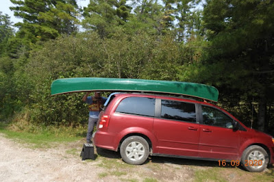 After circumnavigating the lake, we returned to the launch to find 3 fellows getting reading to launch on a week-long camping trip. They were very courteous, and helped us with our gear and even put our canoe up on the roof for us. We wished thanked them and wished them a good trip. Barbara supplied a bag of dog treats for their dog, who was going along. Looking around after they paddled off, we noticed more Yellow-rumped Warblers in the short trees by the launch.